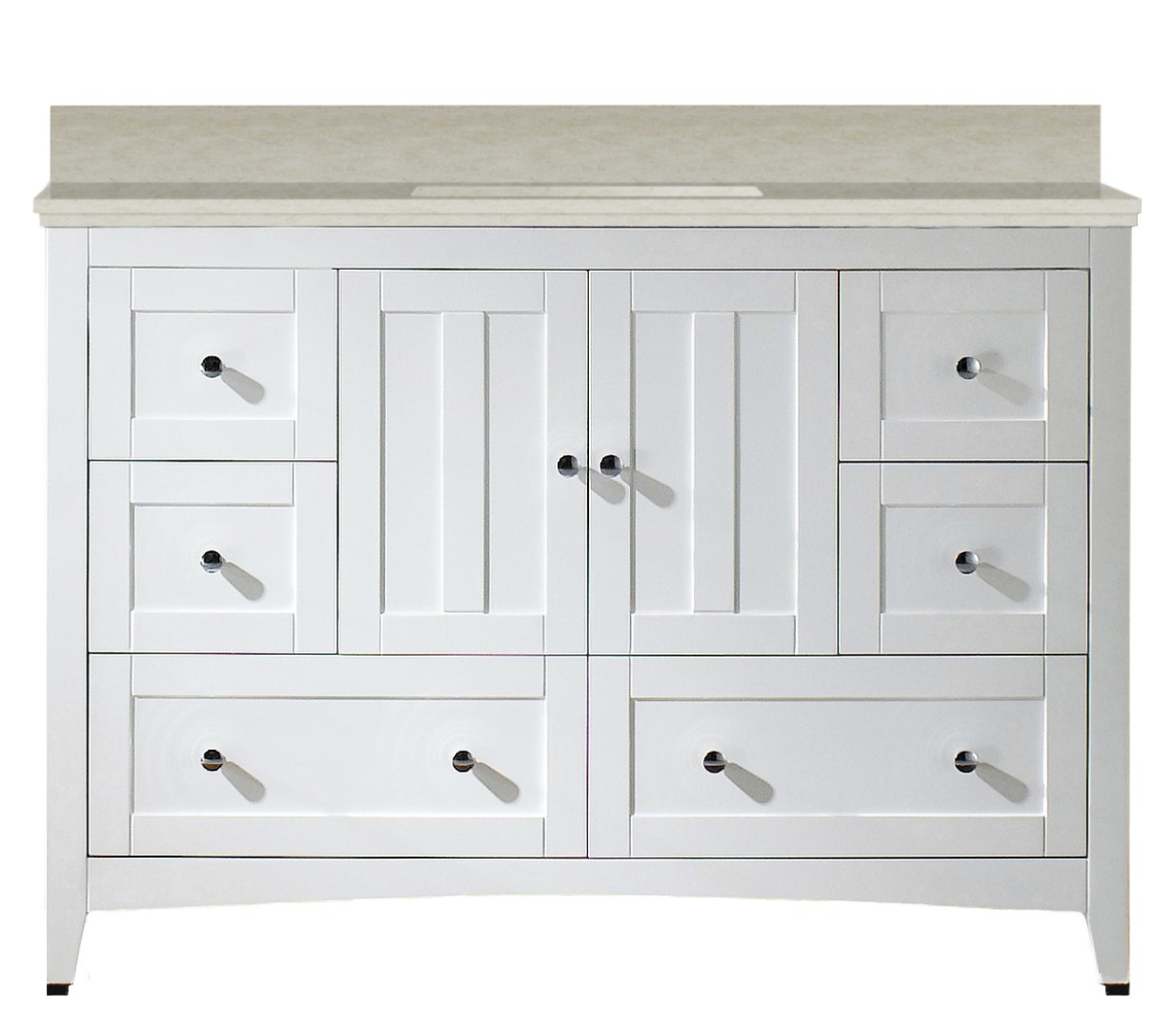 Features a large cabinet with two soft-close doors and European style hinges. Fully adjustable in-out and up-down European style hinges that are completely concealed when doors are closed. Cabinet hardware included. No assembly required. Faucet and accessories not included. Completely finished from all sides including back. Features six drawer constructed with sturdy joints and soft-close slides. Drawers are completely finished on the inside. Vanity base constructed with plywood and veneer. No MDF or chipboard used. Includes adjustable floor levelers under the legs for uneven floors. Knock-out plumbing backboard for easy water supply and drain access. Countertop has smooth, easy to clean surface. Countertop surface has an antimicrobial production protection. Undermount Sink has inside dimensions of 16.5-in. X 11.75-in. and an outside dimension of 18.25-in. X 13.5-in.. Features attractive veining and swirls that give each piece a unique look.. Double fired and glazed for durability and stain resistance. Quality control approved in Canada and re-inspected prior to shipping your order. Sink has a premium biscuit glaze and glossy finish with a kiln dried ceramic construction. 1.75-in. Standard US drain opening