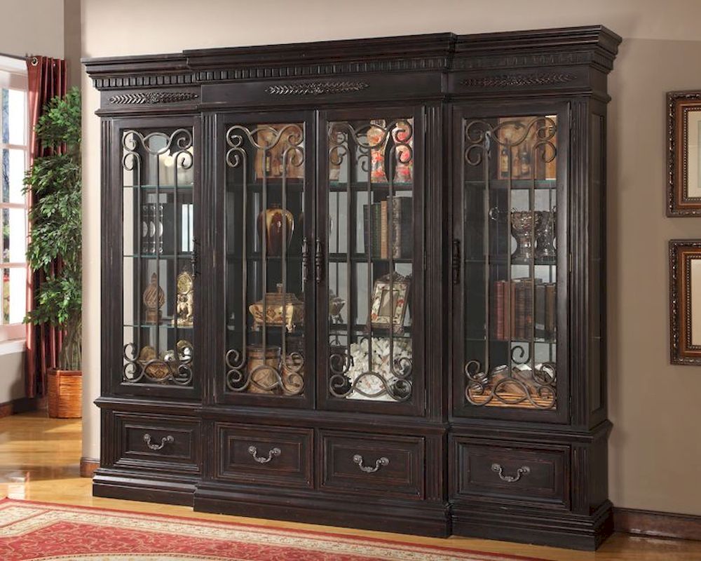 Palazzo is certainly grand. With its hand wrought iron door inserts it will be right at home in the estate with the iron gate at the drive. A full 92” high , this display wall curio set truly makes an impressive statement. Mediterranian influenced carvings and over-sized moldings would make this showpiece right at home in the grandest Italian villa. A vintage burnished black multi-step finish is hand aged for a heirloom look.