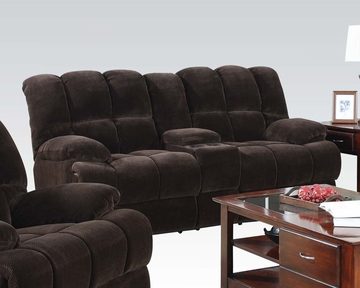 The Ahearn casual reclining sofa collection reflects over sized cozy seating and associated cup holders.This collection utilizes chocolate champion fabric to melt you into a relaxed bliss. The loveseat console makes storage for the remote control and beverages. Hassle free and extremely convenient!!Includes:
