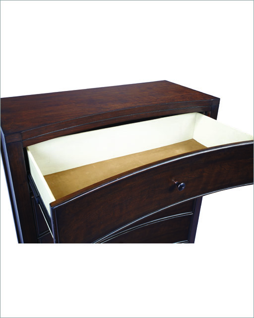 Chest has 5 drawers; Felt-lined top drawer; The Contour collection comes in a Saddle Brown finish; With hardwood solids and cherry veneers.Includes: