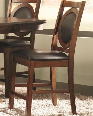 For bold character and comfortable seating, sit down at the Counter Height Dining Side Chair. Made from wood veneers and solids and completed with a beautiful oak finish, this piece is sturdy and warm. The back incorporates a circular cut out with dark brown vinyl upholstery in the center, as well on the seat, providing you with top notch comfort. At the base, the back two legs slightly bow out, and all four legs are connected with stretcher support. To complete the look, join these chairs with the Counter Height Dining Table.Includes: