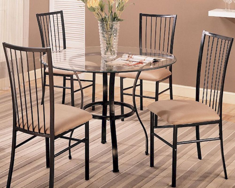 This casual dining set will be a lovely addition to your casual dining room. The elegant dark metal base features gentle curves and a simple design, with a sophisticated round beveled glass table top above. Four matching side chairs feature distinctive vertical slat metal backs, and plush neutral fabric seats for everyday comfort. This beautiful dining set is sure to complement your home decor, creating an inviting space to gather daily for family meals.Includes: