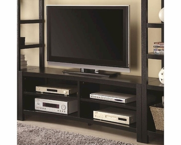 An inverted curve at the front adds intriguing style to this casual cappuccino finish media console. Four shelves give you plenty of room to add components for use with your TV. Enjoy a casual contemporary look in your living room or family room with this TV stand. It accommodates widescreen TVs up to 60 inches. Use two of the coordinating media towers with this TV console for a complete wall unit set.Includes:
