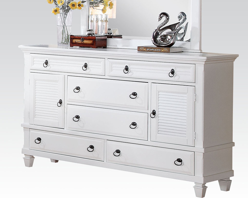 With Southern comfort, our Merivale white collection exudes sophisticated style that nevertheless invites you to feel at home in your bedroom. Louvered details throughout offer updated cottage design while cottage door fronts provide an alternative in the dresser. Ring pulls and cupped hardware adorn drawers and doors, and reverse pyramid feet accentuate the casual style refined look.Includes: