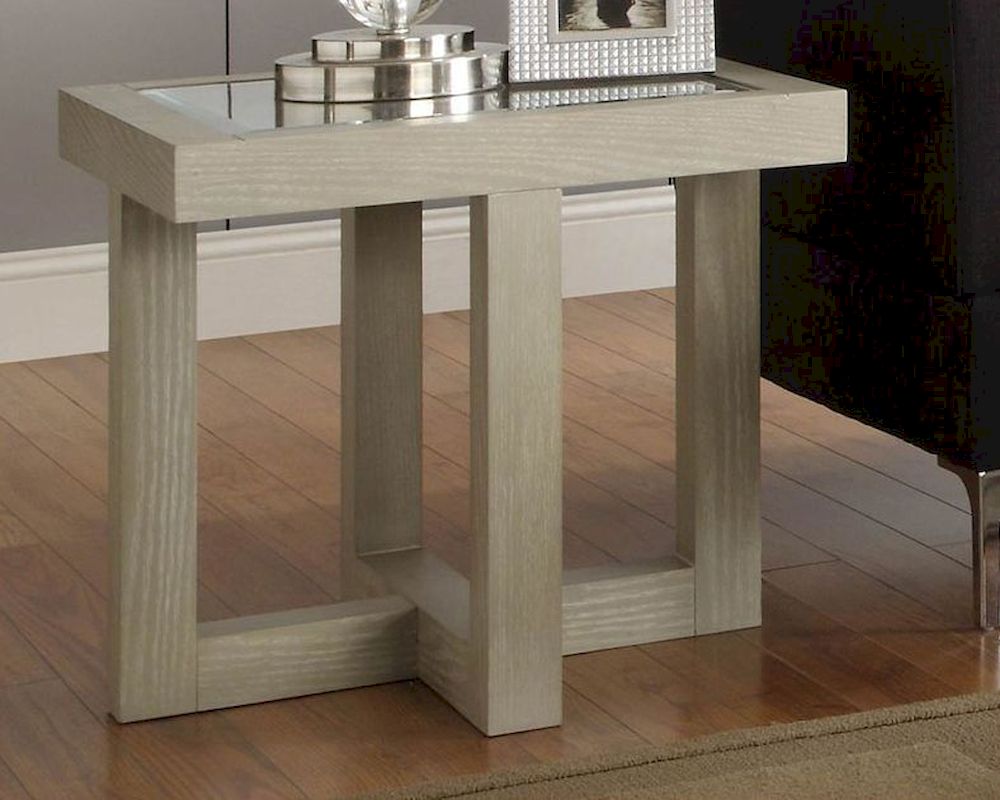 The highly contemporized styling of the Guerrero Collection will blend perfectly with your modern decor. Inset glass gives you a clear view of the geometric framework, making the table collection not just a functional piece of furniture but art as well. The oak veneer is complimented by a cool grey finish further lending to the modern feel.Includes: