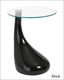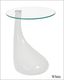 The top is a tempered glass circle with an 18" diameter. The base is something else. Made of high gloss molded fiberglass the shape could be described as natural or organic. Like nature, not a straight line to be found. It brightens up and lightens up any room.