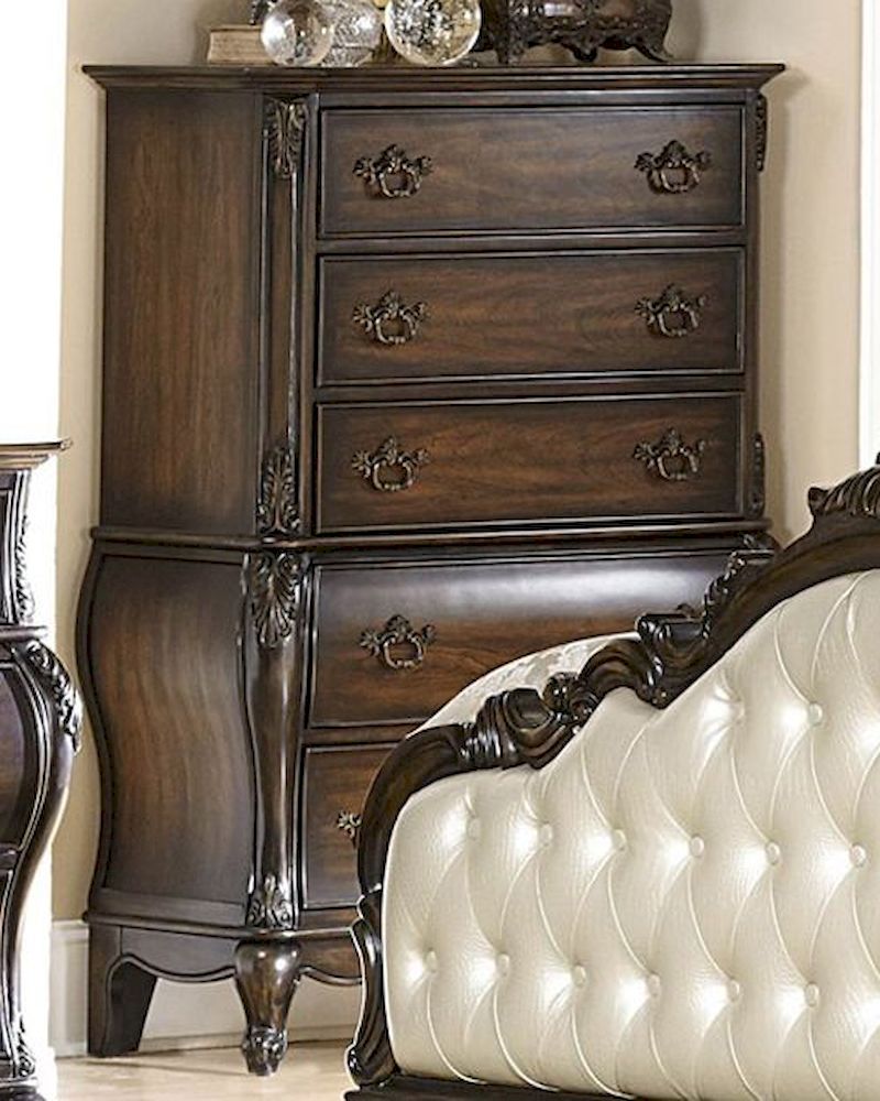 With an unexpected contrast that only serves to heighten the elegant profile, the Bayard Park Collection will provide you the perfect opportunity to show off your personal style. A trendy pearl button-tufted headboard insert serves as the focal point of the collection. Offered in a dark brown cherry finish and heavily carved in traditional style - featuring shell motif, distinctly curved legs and bombe case pieces - the Bayard Park Collection is a modern take luxurious traditional design.