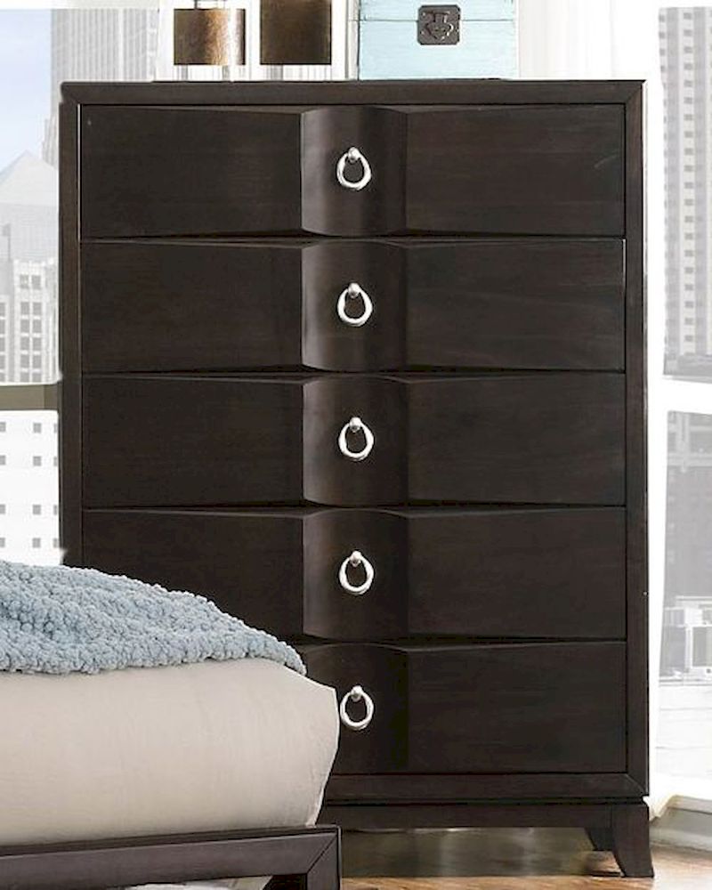With an air of urban sophistication, the Edmonston Collection will be a bold statement in your newly decorated bedroom. The bold oval ring hardware is an intense contrast to rich espresso finish that covers the collection. Concave accents punctuate the design and lend to the contemporary aesthetic. With the pull of a handle, drawers open to reveal additional storage contained within the footboard.