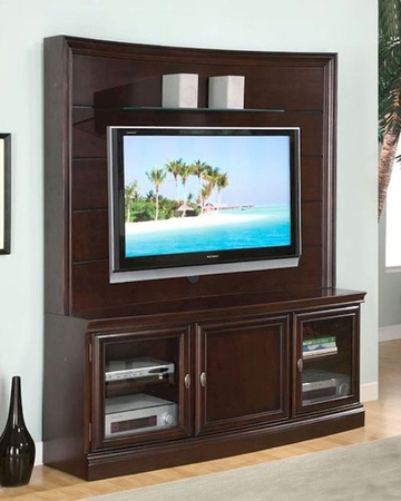 This retro era media center has curved fronts and a back panel curving backward for a well balanced and interesting design. The rich espresso finish on cherry veneer and select hardwoods plus the optional side piers enhances the era’s character and functional use.
