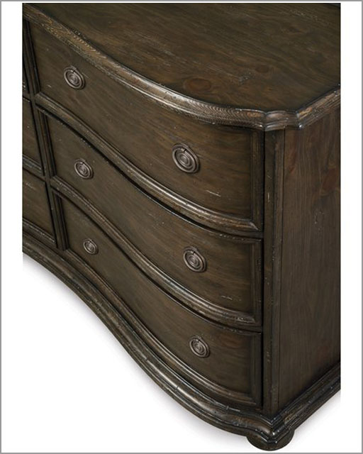 Warmth, heritage, tradition, comfort. Combining graceful lines with finely stacked molding, bowed drawer-fronts and undulating camelback curves, our Muirfield collection welcomes every family home. In classic Pine veneer and select Solid Hardwood, with Antique Pewter hardware and in a dark distressed Pine finish.