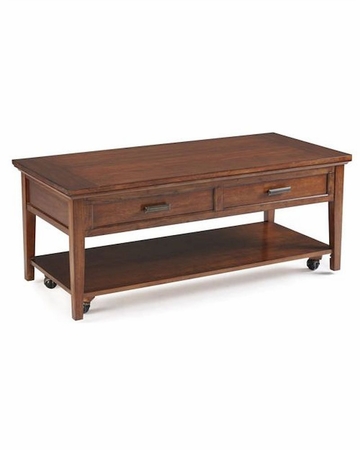 Grab this rectangular lift top cocktail table from the Harbor Bay collection by Magnussen for its appealing look. Crafted from a durable combination of hardwood solids and cherry veneers, the simple table can be used to serve drinks and special treats. Equipped with two drawers for storage and an empty space below, this toffee finished table can hold books, vases, essentials and other decorative items. Adorned with antique brass hardware for drawer fronts, this table with casters is very easy to move.