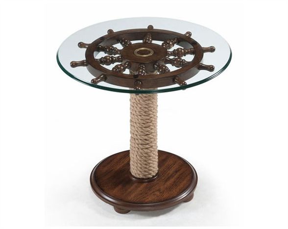 Now get the feel of steering a ship right in your living room with this striking round accent table. Complete with maritime charm, this one-of-a-kind accent table exhibits a tempered glass top that is supported by an elaborate ship wheel that has a brass ring in the center. The wound-rope pedestal reminiscent of sailing trips is placed on a rich dark oak finished pedestal. A piece of art by itself, you can use this table as an accent piece thereby adding a dash of seafaring adventure to your decor.