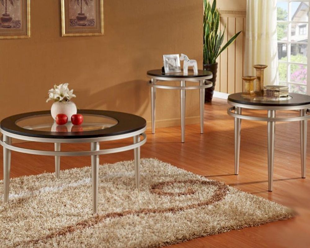 The round, ebonized-finished, wood table tops of the Hodges Collection feature offset round glass inserts and brushed nickel metal tubular legs in this contemporary 3 piece of offering.Includes: