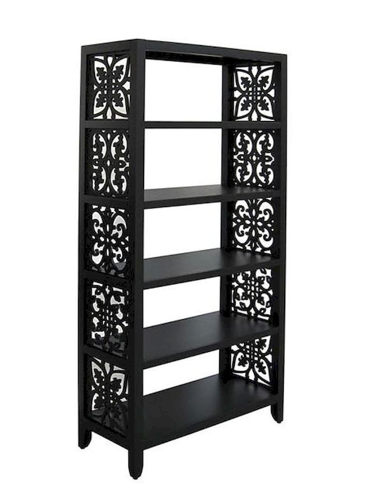 This bookcase has a truly designer feel. The overall simple shape and glossy black finish brings the attention to the laser cut fretwork on each side. This piece is perfect for display or used in combination with the matching desk. It features five fixed shelves.Includes: