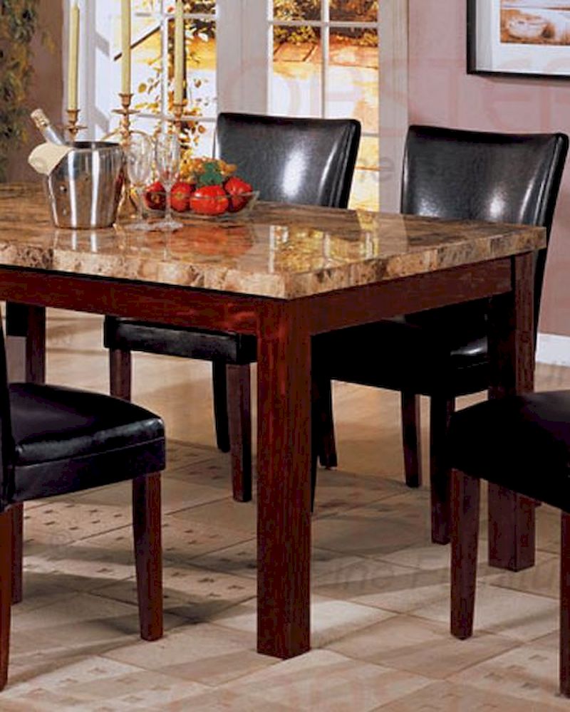 It features a Rich Cherry finish, classy marble table top and wood construction.